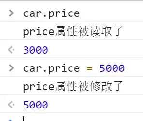 })通过Object.defineProperty()方法给car定义了一个price属性,并把这个属性的读和写分别使用get()和set()进行拦截,每当该属性进行读或写操作的时候就会触发get()和set()。如下图: